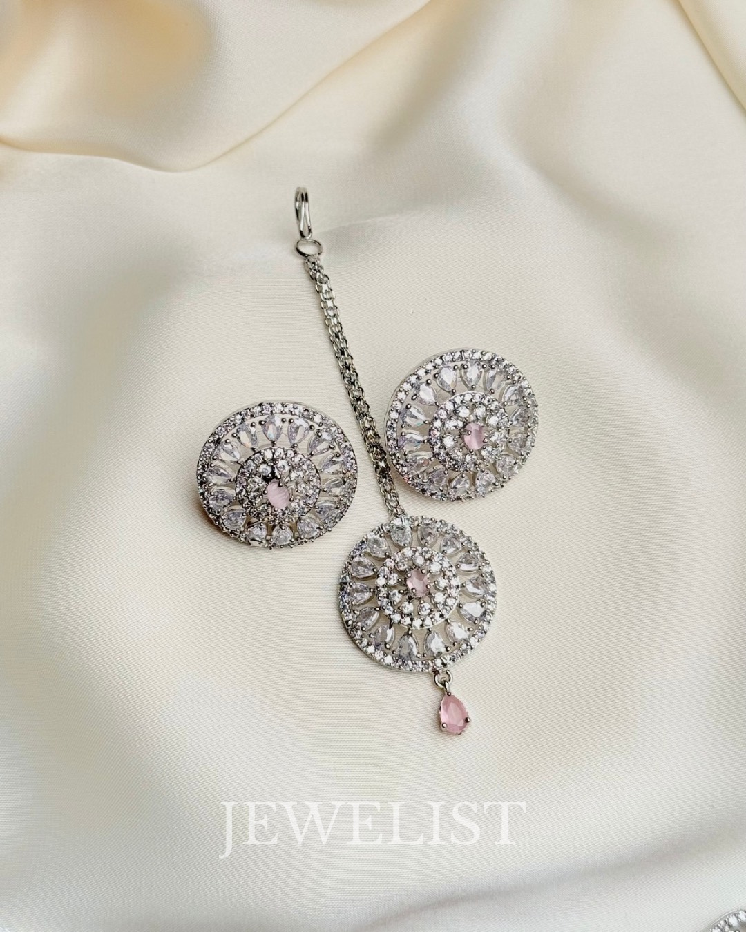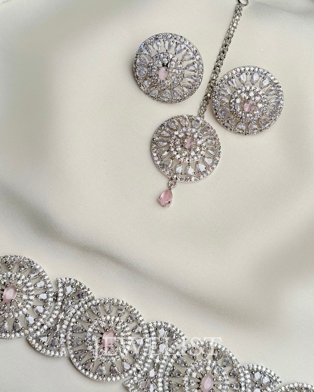 Perfectly proportioned circular earrings mirror the central motif of the choker, offering balance and harmony to the overall look. Completing the set is a delicate headpiece, finished with a polished silver-tone chain that ends in a graceful pink teardrop accent — adding a subtle touch of traditional South Asian elegance.