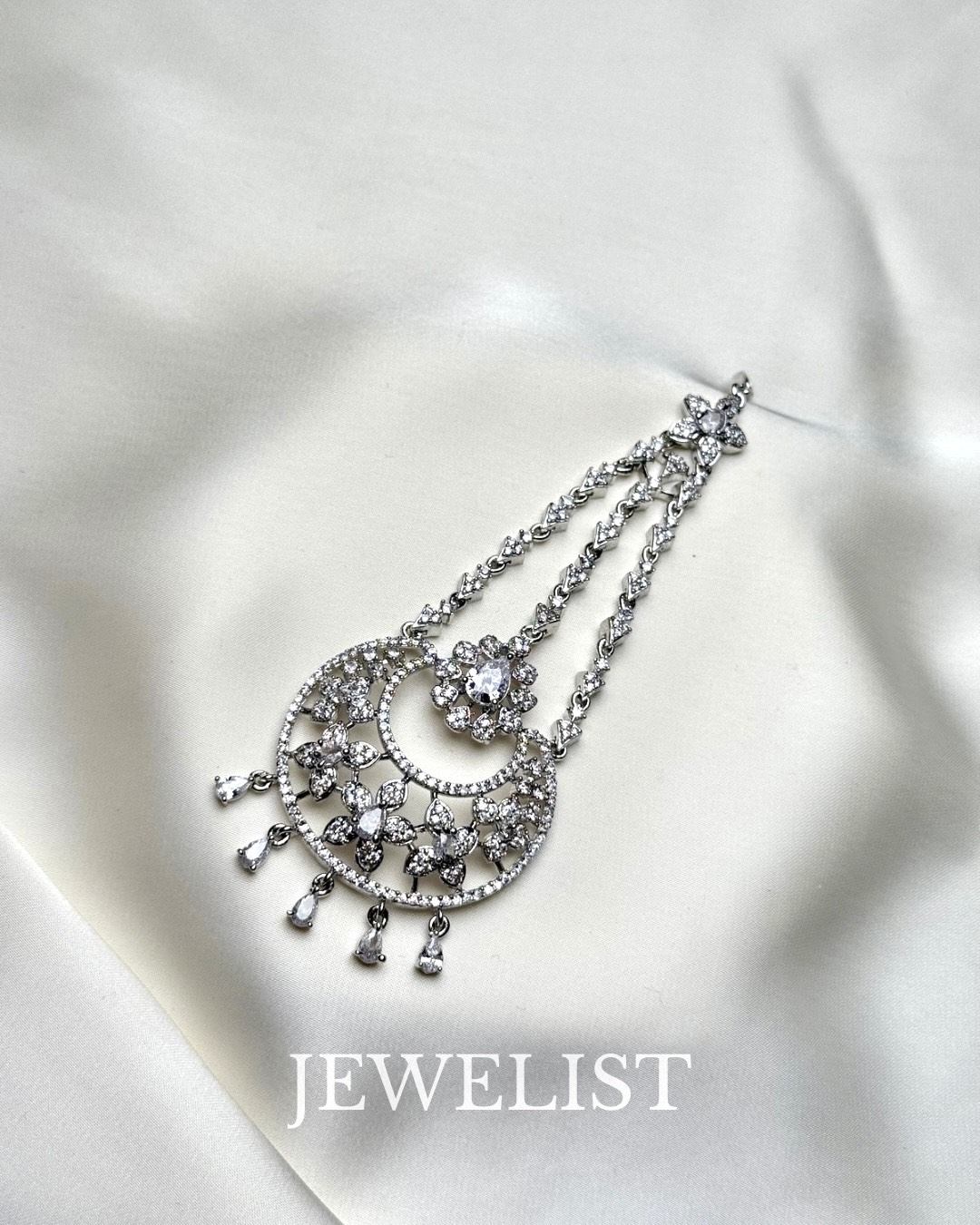 Perfect for mehndi, baraat, nikkah, or walima, the Floral Chain Jhoomer enhances both traditional and contemporary bridal outfits such as lehengas, ghararas, peshwas, and maxis. Finished in a luxurious silver tone, this accessory pairs effortlessly with soft pastels, deep jewel tones, and classic bridal palettes.