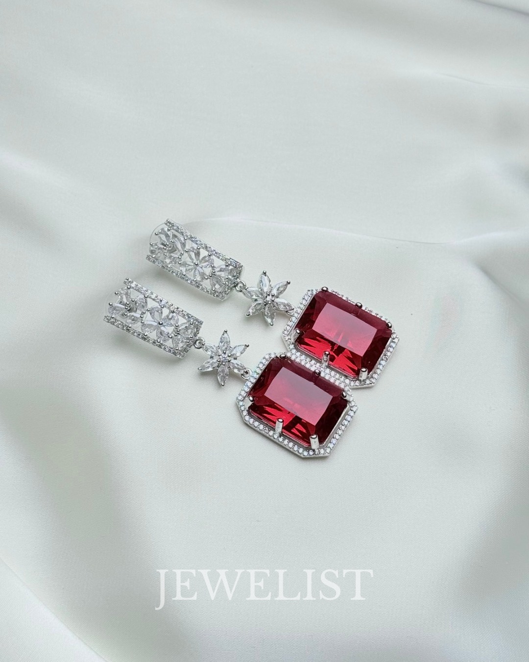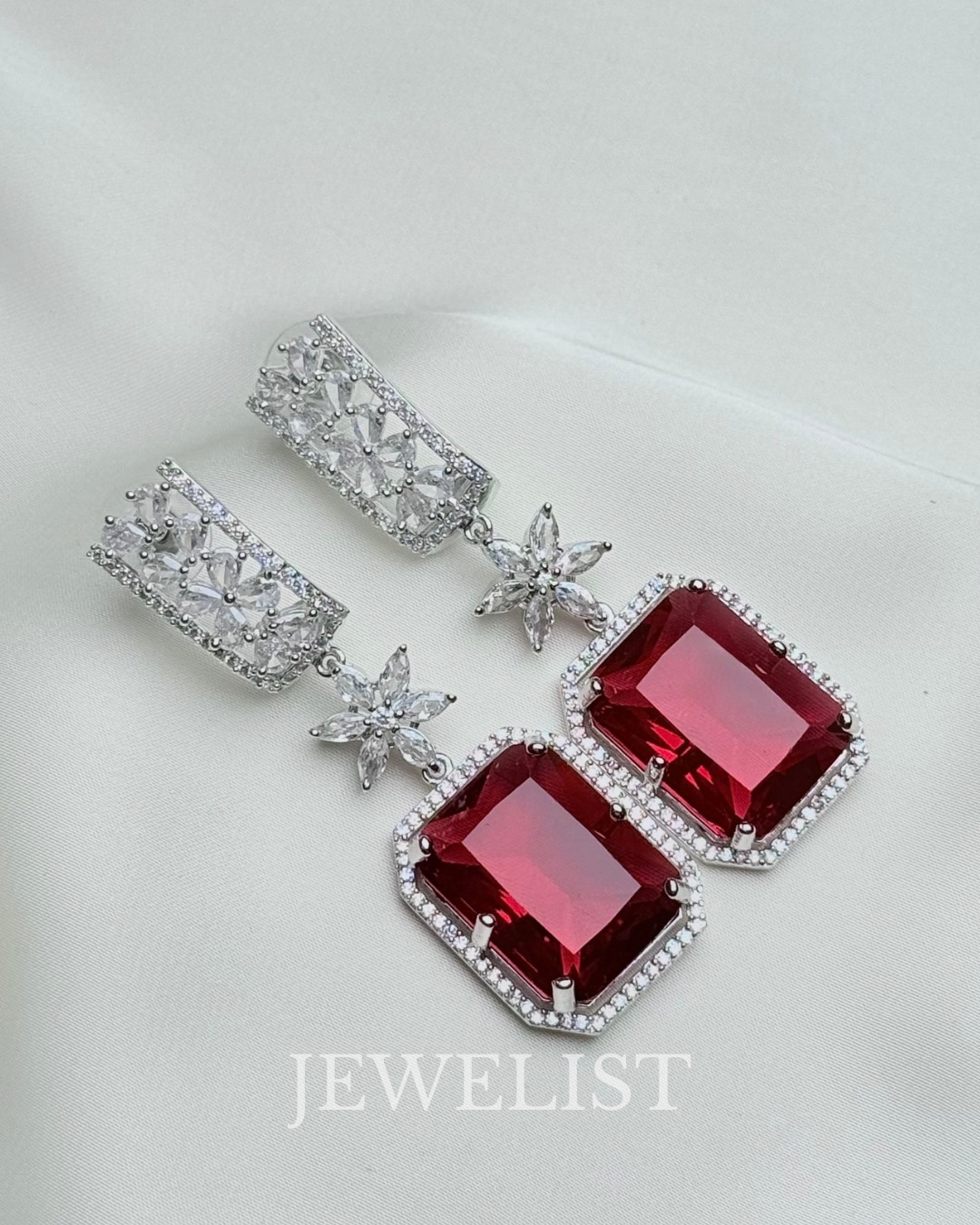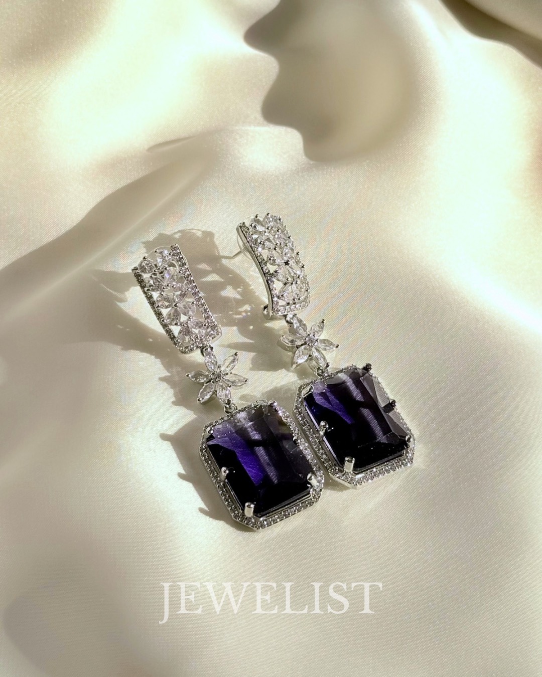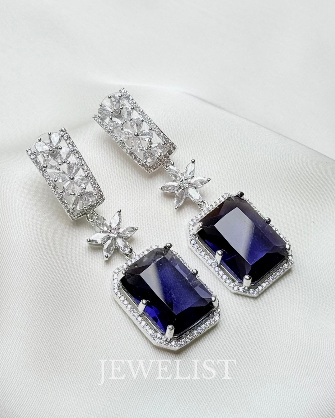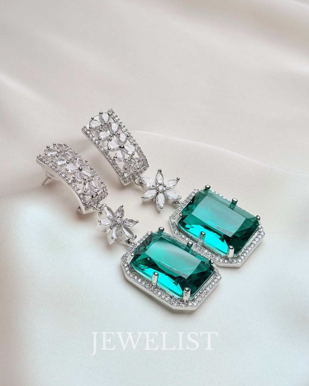 The gemstone is framed with a fine halo of micro-pavé crystals set in premium silver-tone metal, offering a luxurious finish comparable to fine jewellery. Whether you’re styling a bridal outfit, a party saree, a formal gown, or a festive lehenga, these earrings instantly elevate your look with timeless sophistication.