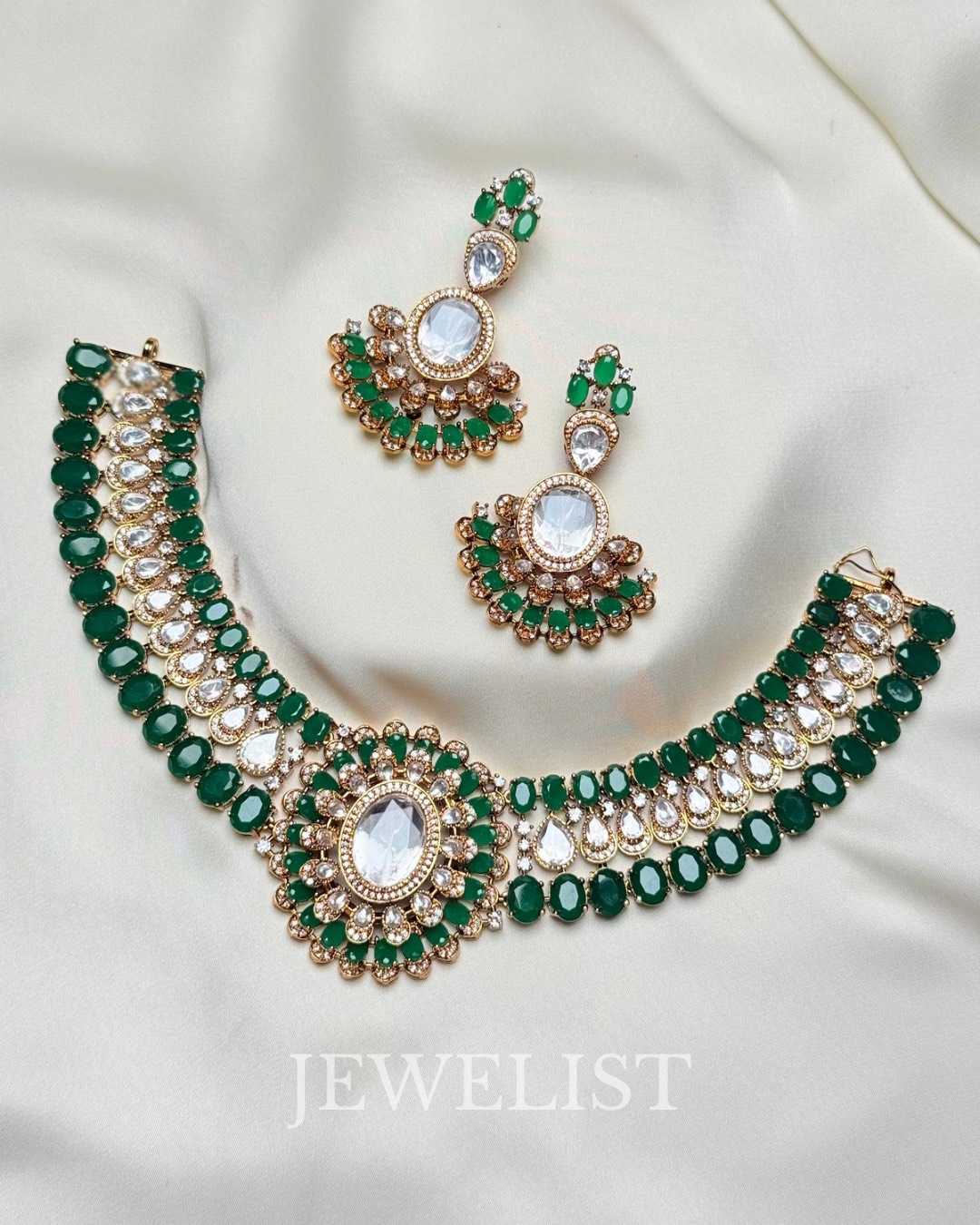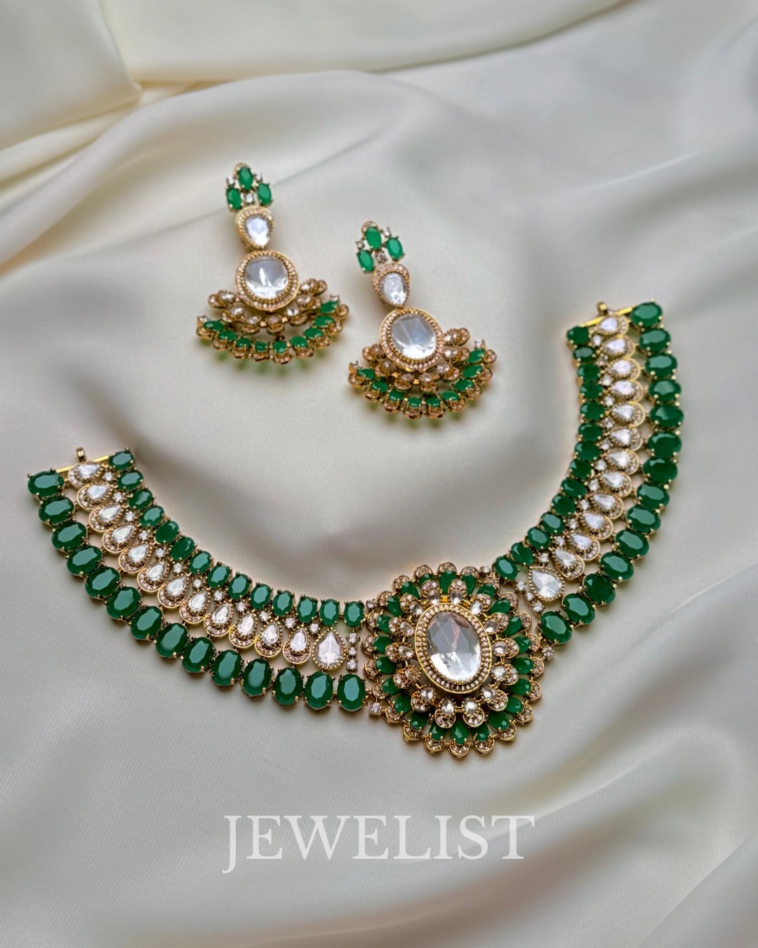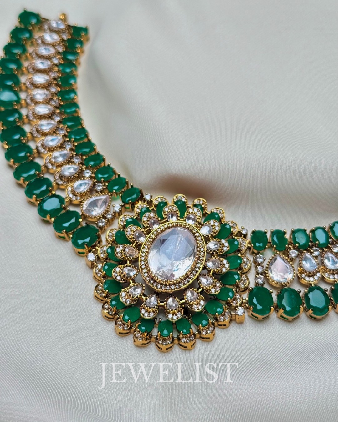 The necklace features a bold, oversized floral central motif showcasing a large oval white stone, encircled by a lush ring of emerald-green beads and sparkling white accents. On both sides, a double-layered arrangement of oval emerald stones and teardrop-shaped white clusters forms a regal collar, making this piece the perfect choice for brides seeking a majestic, traditional look with a modern touch.