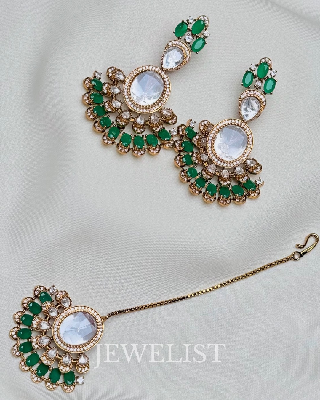 The accompanying chandbali earrings mirror the necklace’s luxurious aesthetic. Each earring includes a refined upper stud adorned with emeralds, followed by a graceful crescent drop embellished with emerald stones, crystal-white teardrops, and delicate gold-tone detailing. The tikka completes the set with matching charm and meticulous craftsmanship.