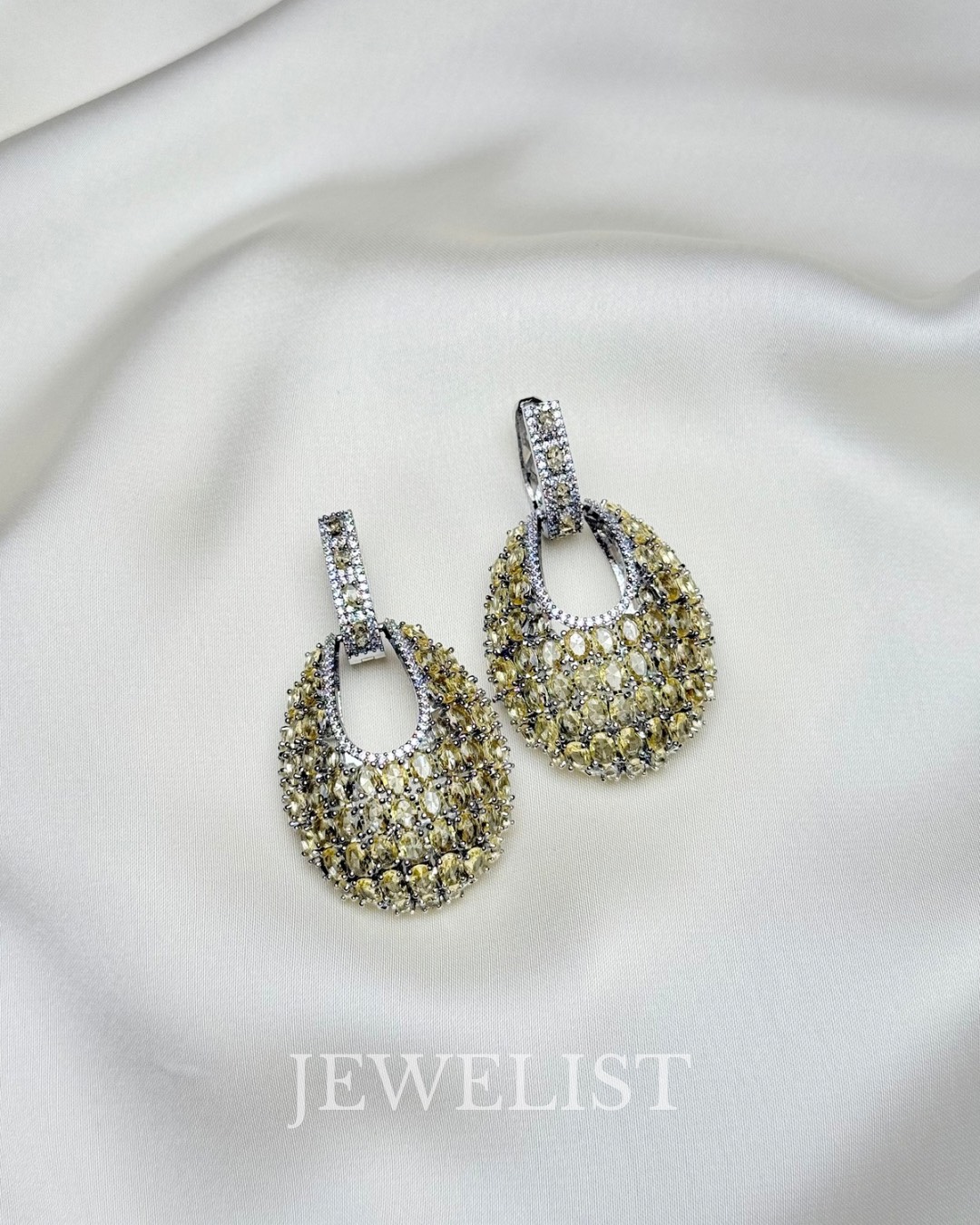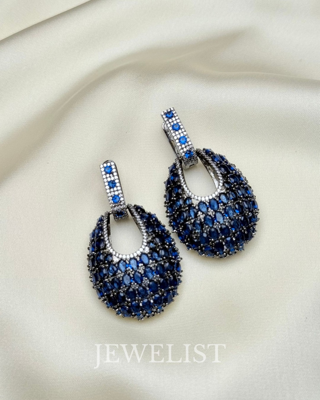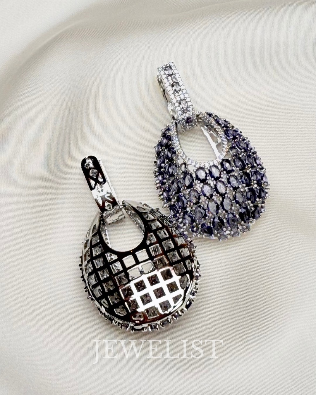 Step into timeless elegance with Paved Drop Hoops by Jewelist.pk – a luxurious addition to your jewellery collection. Designed with a bold teardrop silhouette, these earrings feature a brilliant silver-tone and oxidised finish that exudes modern sophistication. The surface is fully paved with marquise-cut gemstones arranged in a basket-weave pattern, creating a sparkling effect from every angle.