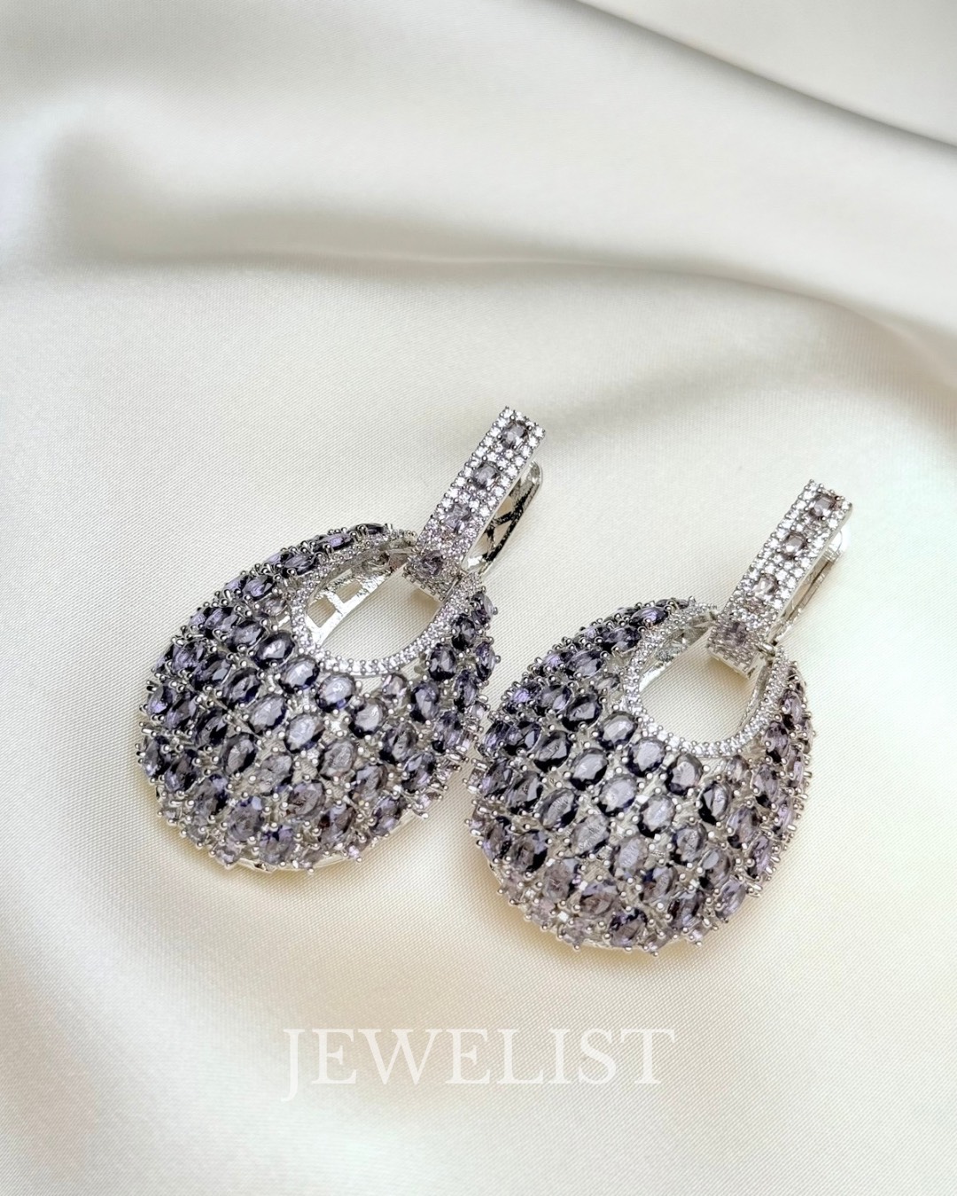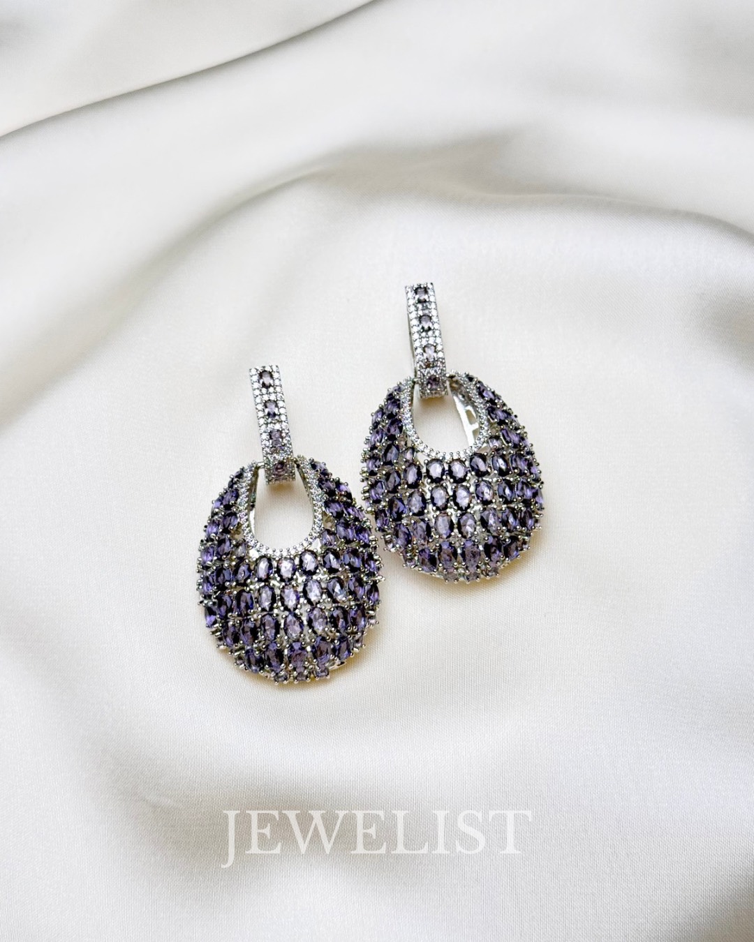 Each hoop is crafted with precision and detail. The sleek clasp is also adorned with glittering stones, ensuring that no part of the design goes unnoticed. Available in a striking range of colours – smoky purple, deep blue, lush green, pastel pink, and sunny yellow – these earrings are versatile enough to complement bridal wear, festive ensembles, or everyday chic outfits.