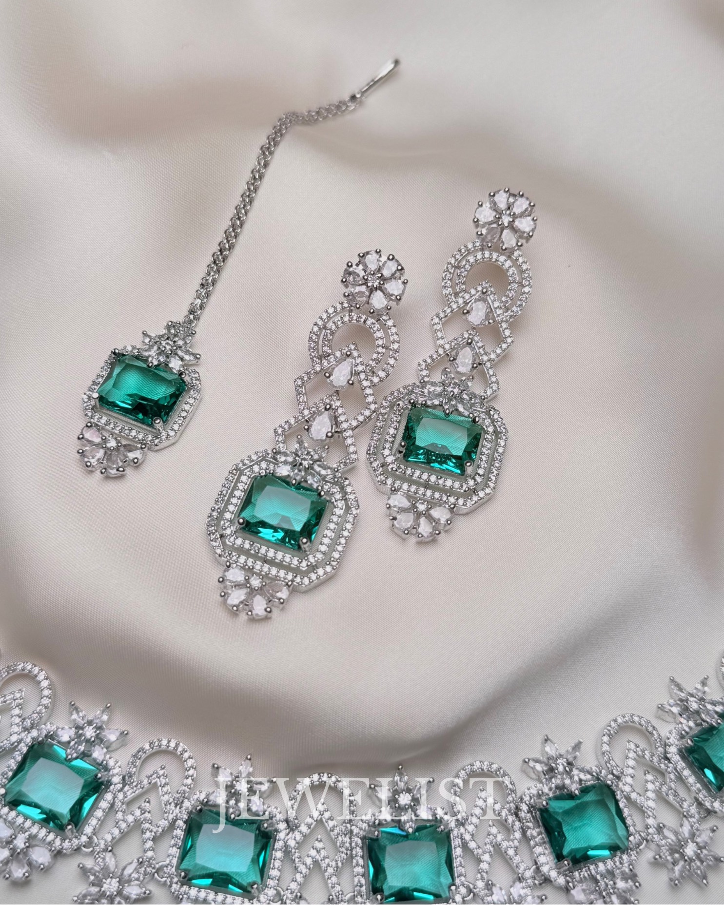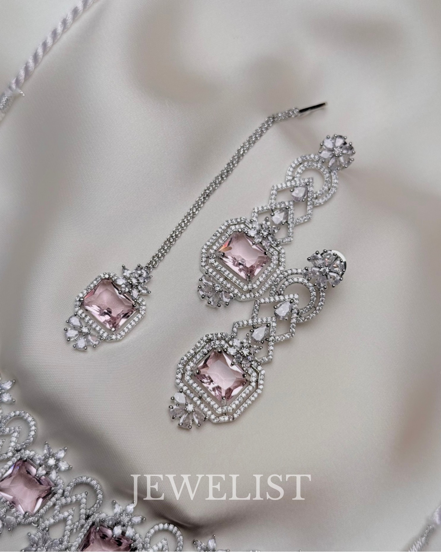 The Prism Choker Set features a bold choker necklace, matching drop earrings, and a pendant accessory, all crafted with dazzling geometric-cut stones in radiant emerald green and blush pink tones. The central square-cut prisms are surrounded by intricate crystal-studded patterns, creating a mesmerizing play of light that lives up to its name – “Prism.” The floral and lattice-inspired motifs add a touch of tradition, while the vibrant stones keep the design fresh and contemporary.