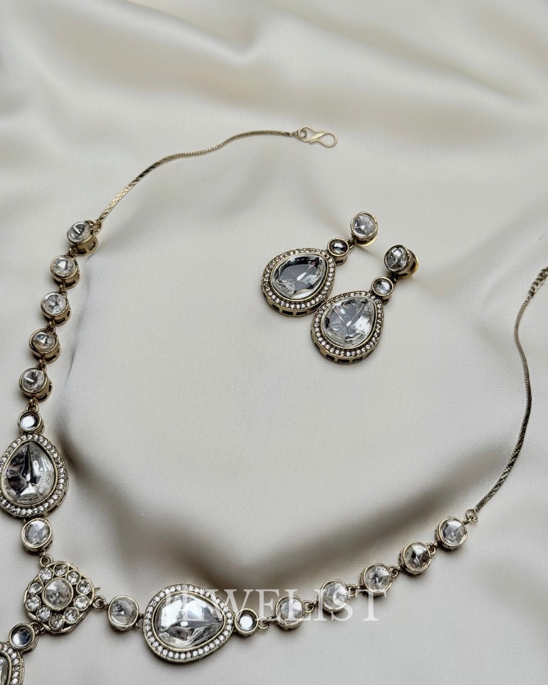 The necklace showcases oval and teardrop-shaped Polki stones, each bordered with fine gold-toned detailing to create a regal, luxurious finish. The accompanying drop earrings complete the look — elegant yet statement-making. Whether you wear it with a bridal lehenga, saree, or formal outfit, this Jewelist jewellery set will radiate timeless beauty and sophistication.