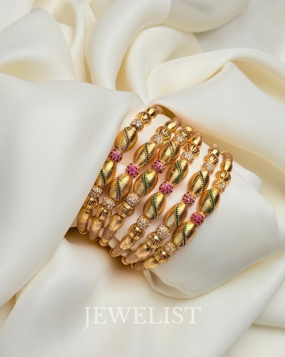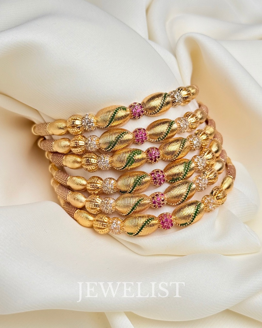 Each bangle is meticulously crafted with premium materials that reflect the intricate craftsmanship Jewelist Jewellery is known for. The fine detailing, along with a mix of pink, green, and white crystal embellishments, gives the Riva Bangle Set a lively and festive look, making it the perfect accessory for weddings, Eid, parties, or casual glam.
