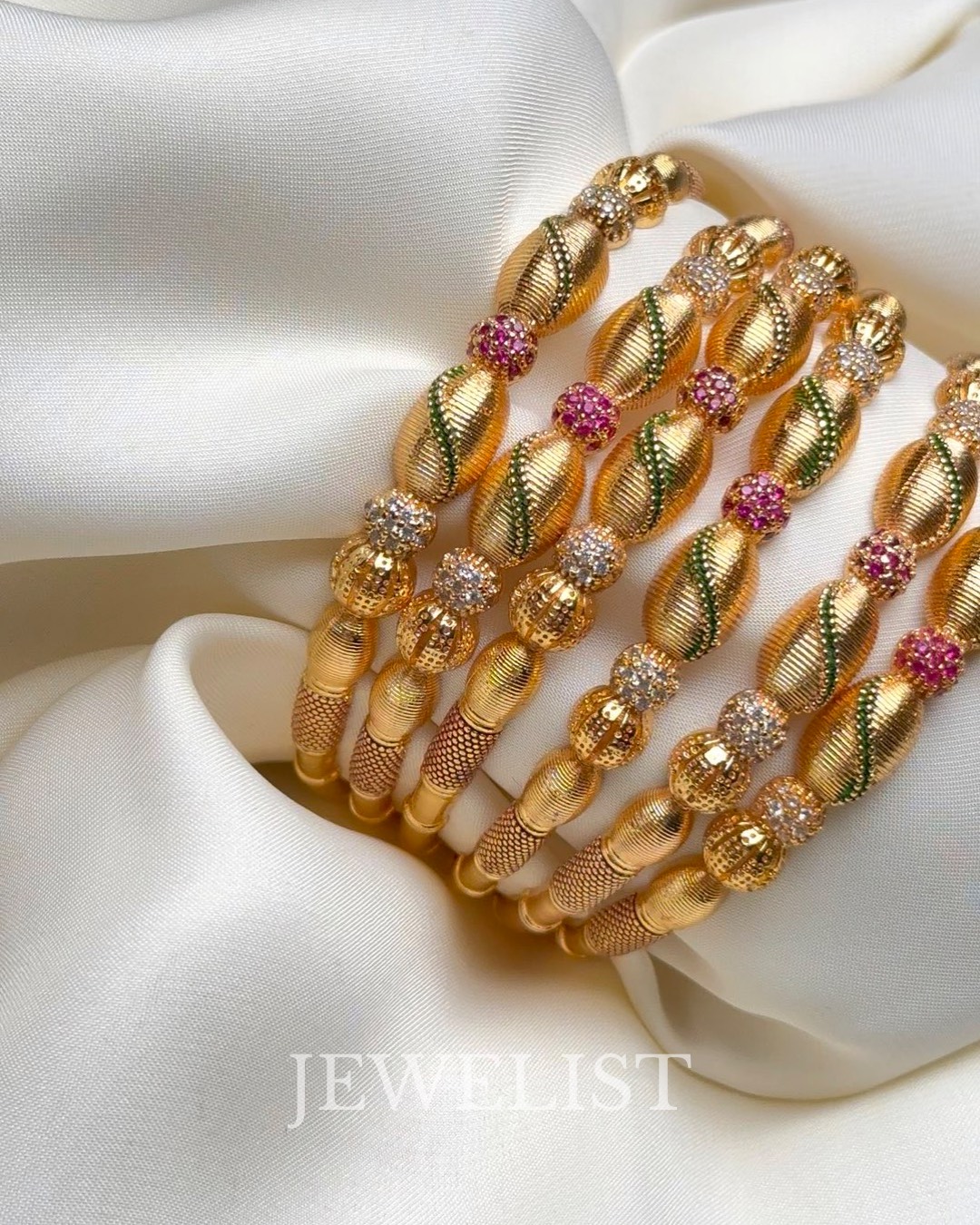 Introducing the Riva Bangle Set by Jewelist.pk — a radiant expression of grace and modern artistry. Designed for the contemporary South Asian woman, this artificial jewellery piece blends heritage with a touch of vibrant charm. The Riva Bangle Set features golden-toned bangles adorned with shimmering textured beads and crystal-studded floral accents, creating an effortless balance of luxury and elegance.