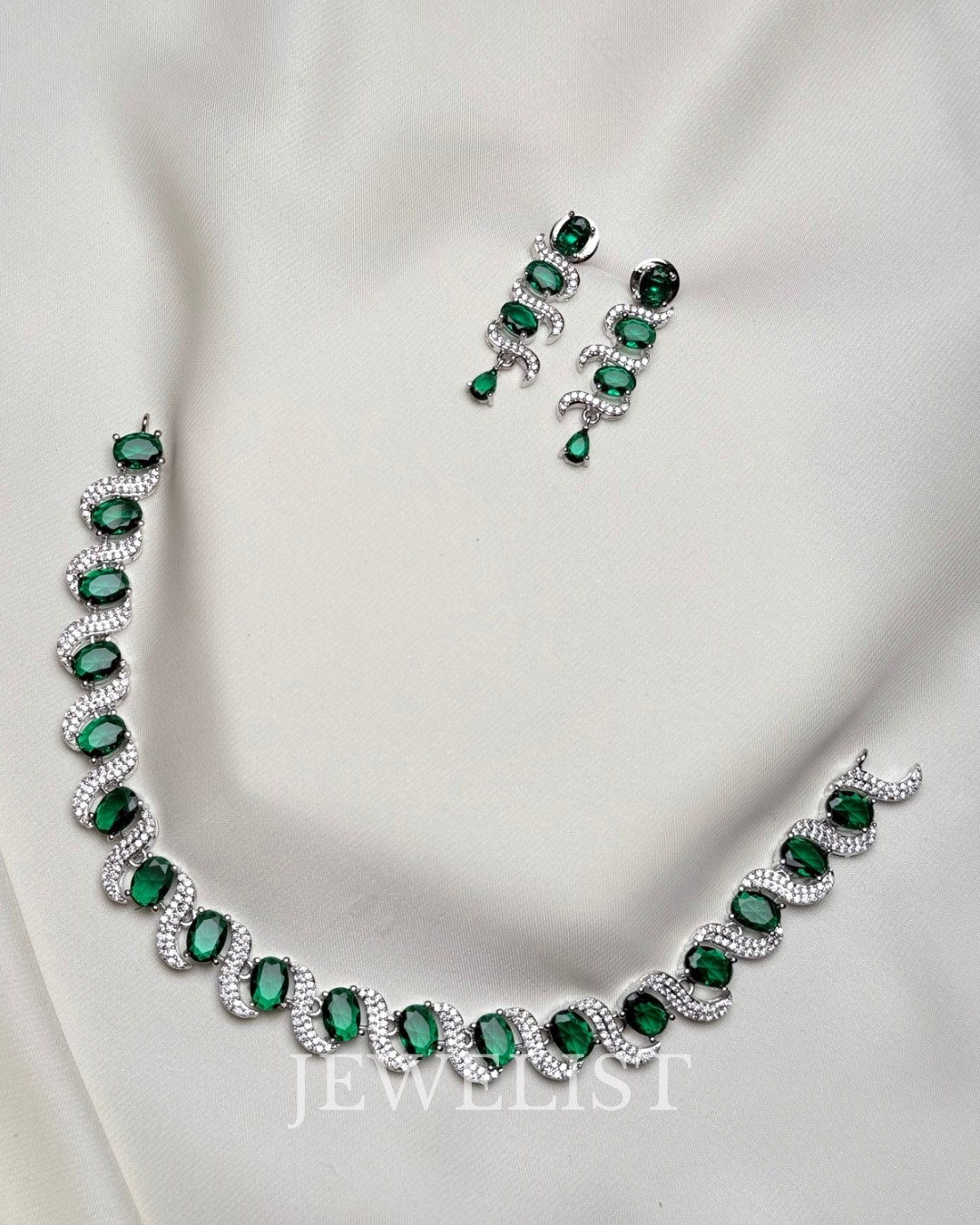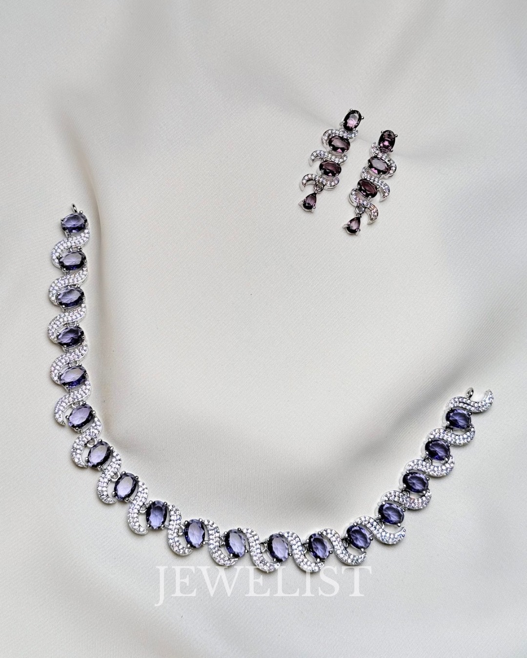 The Rivulet Gemstone Set features a signature wavy pattern, gracefully flowing like a river—hence the name. Each curve alternates between shimmering pavé-set white stones and striking oval-cut coloured gemstones. Available in four stunning colours—Emerald Green, Pink Quartz, Amethyst Purple, and Clear White—this jewellery set offers a stylish option for every outfit and mood.
