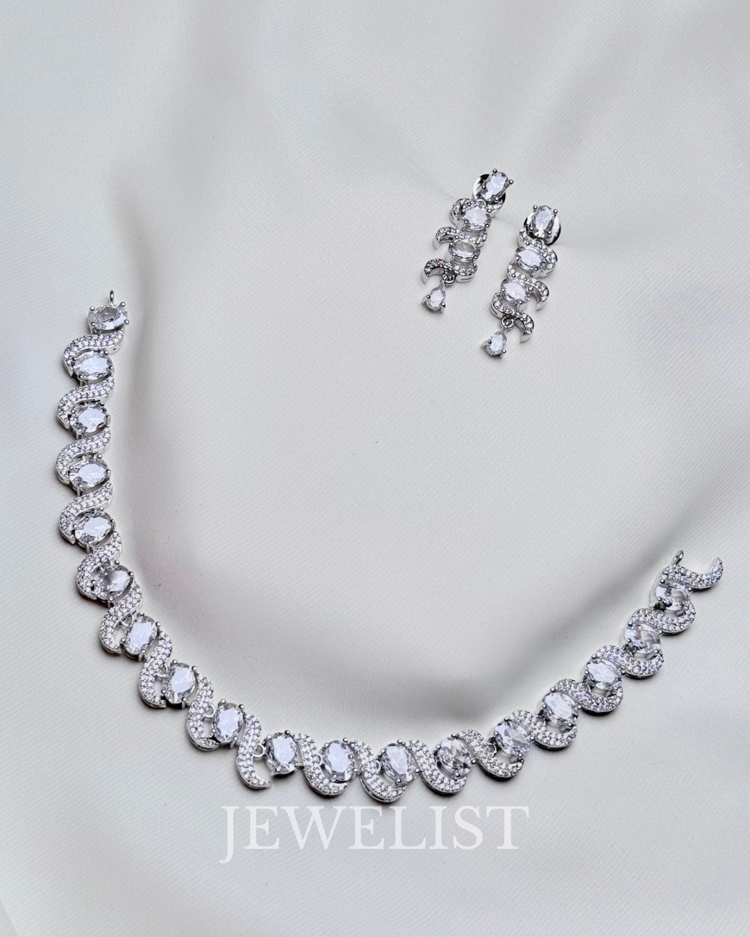 The necklace sits beautifully on the neckline, creating a sophisticated silhouette suitable for both formal occasions and evening wear. The dangling earrings mirror the same rhythmic design, giving the complete set a coordinated and contemporary aesthetic. Whether you’re attending a dinner, engagement, party, or festive function, this piece elevates your look without overpowering it.