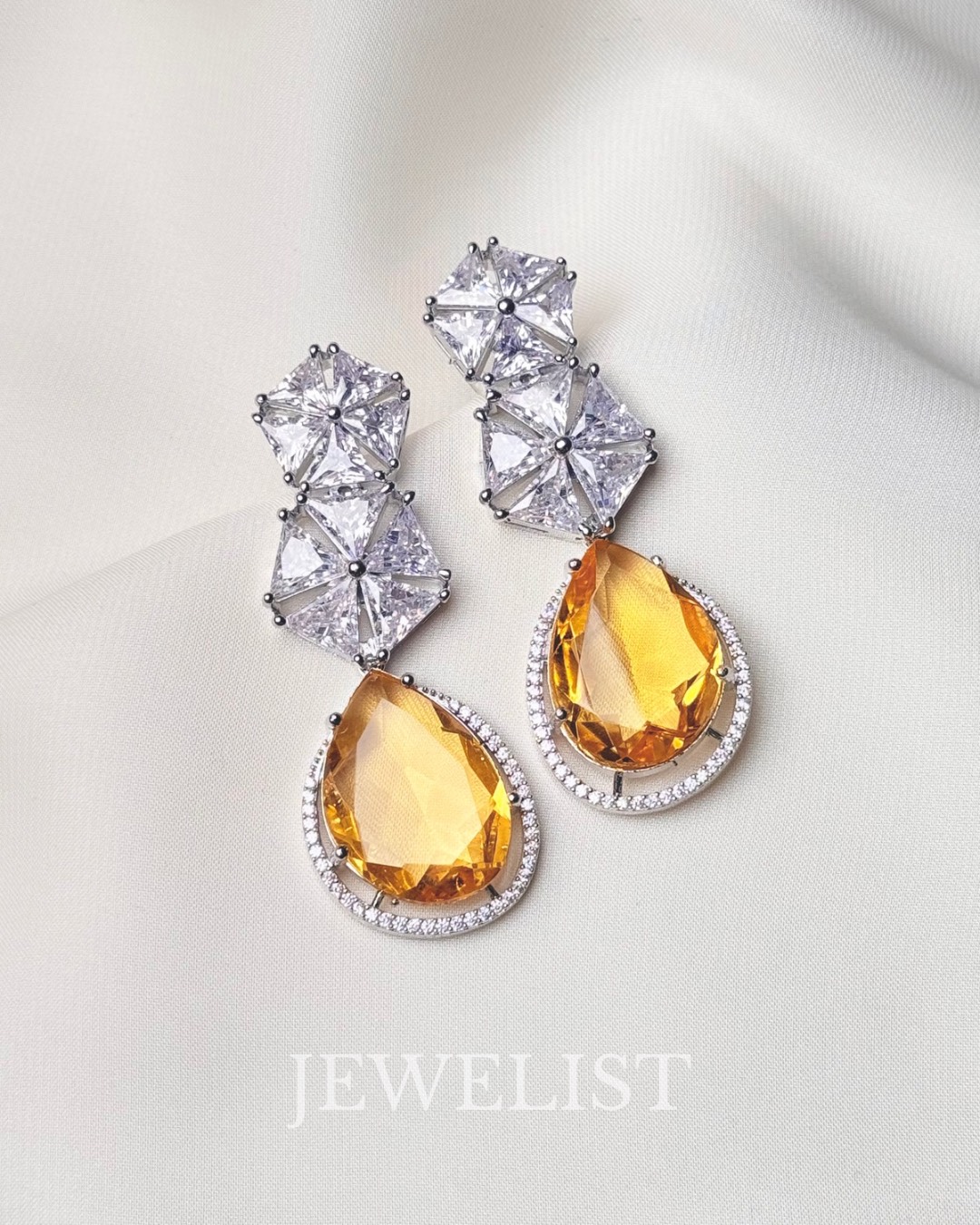 Each pair of Starlight Drops showcases a mesmerizing teardrop gemstone — available in Aqua, Yellow, and Clear — set beneath geometric crystal clusters that exude luxury and brilliance. The sleek silver finish adds a sophisticated charm, creating a statement look that pairs perfectly with both eastern and western attire.