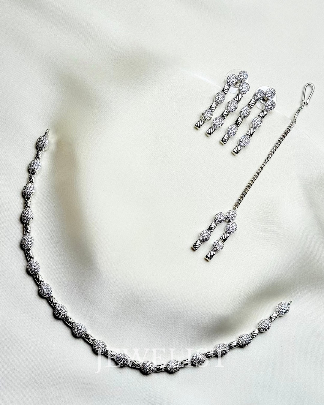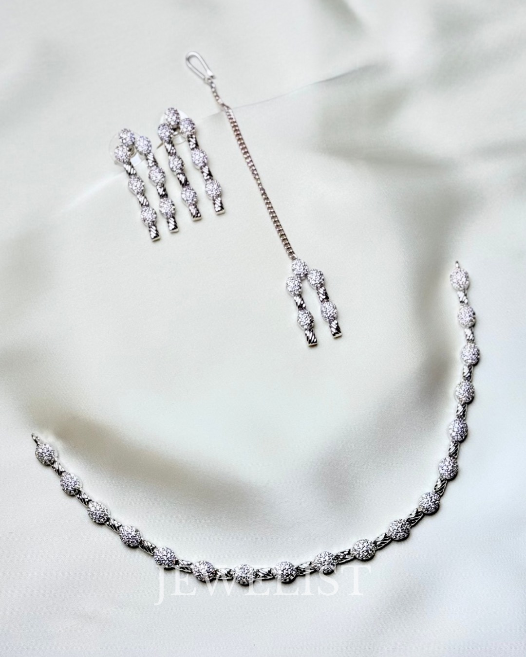 Starlight Orb Set by Jewelist.pk is a breathtaking fusion of luxury, elegance, and modern artistry. Designed for women who appreciate refined sparkle, this set brings together a dazzling collar necklace, matching earrings, and an intricately crafted headpiece—each featuring the iconic pave crystal orbs that define the Starlight Orb Set.