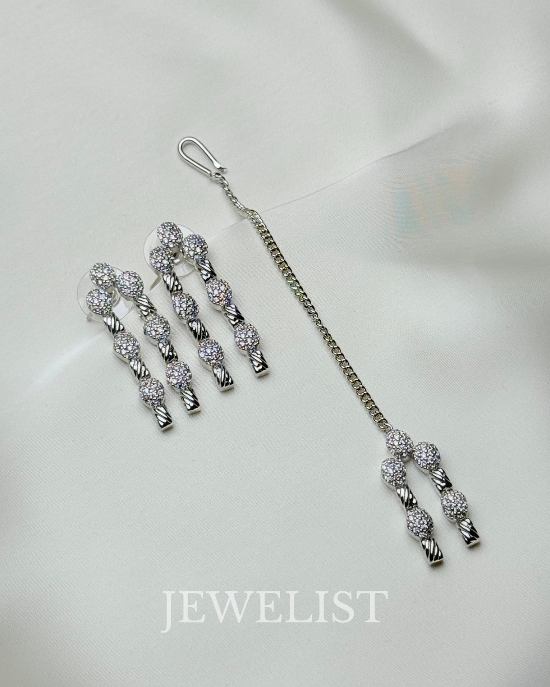 To complete the ensemble, the set includes statement earrings featuring cascading orb clusters—elegant, chic, and designed to move gracefully with you. The highlight is the coordinated headpiece: a stunning chain accessory adorned with signature pave orbs that sit effortlessly along any hairstyle, offering a flawless, cohesive finish. This added element transforms the Starlight Orb Set into a complete South Asian jewellery statement, perfect for brides, bridesmaids, and festive styling.