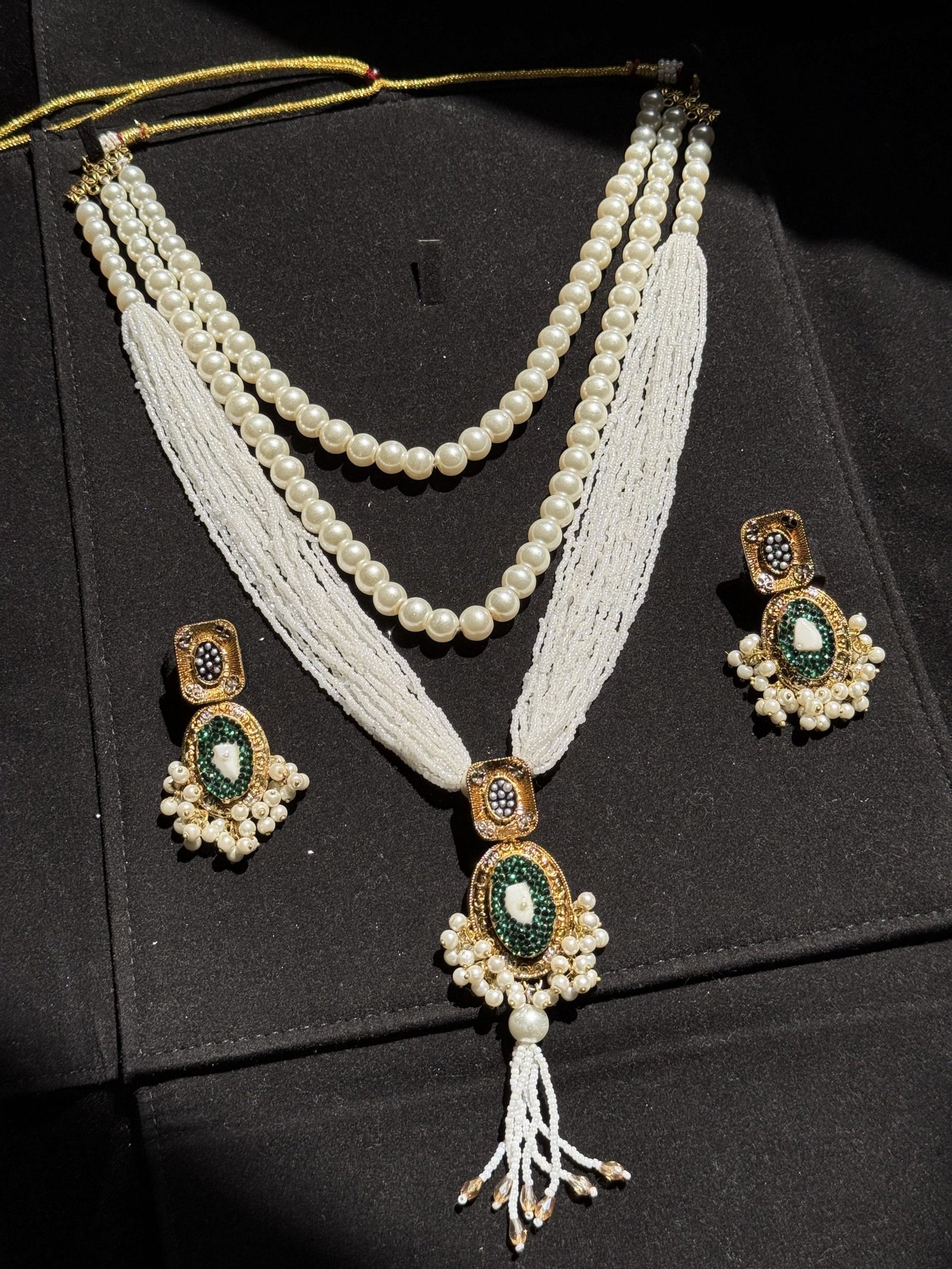 Adorn yourself with timeless elegance with our Emerald Accent Three-Layer Pearl Mala Set. This stunning set features a beautifully crafted three-layer pearl mala, a captivating emerald-toned pendant, and matching earrings. The combination of luminous pearls and vibrant emerald accents makes this set a perfect choice for bridal wear, festive celebrations, and special occasions.