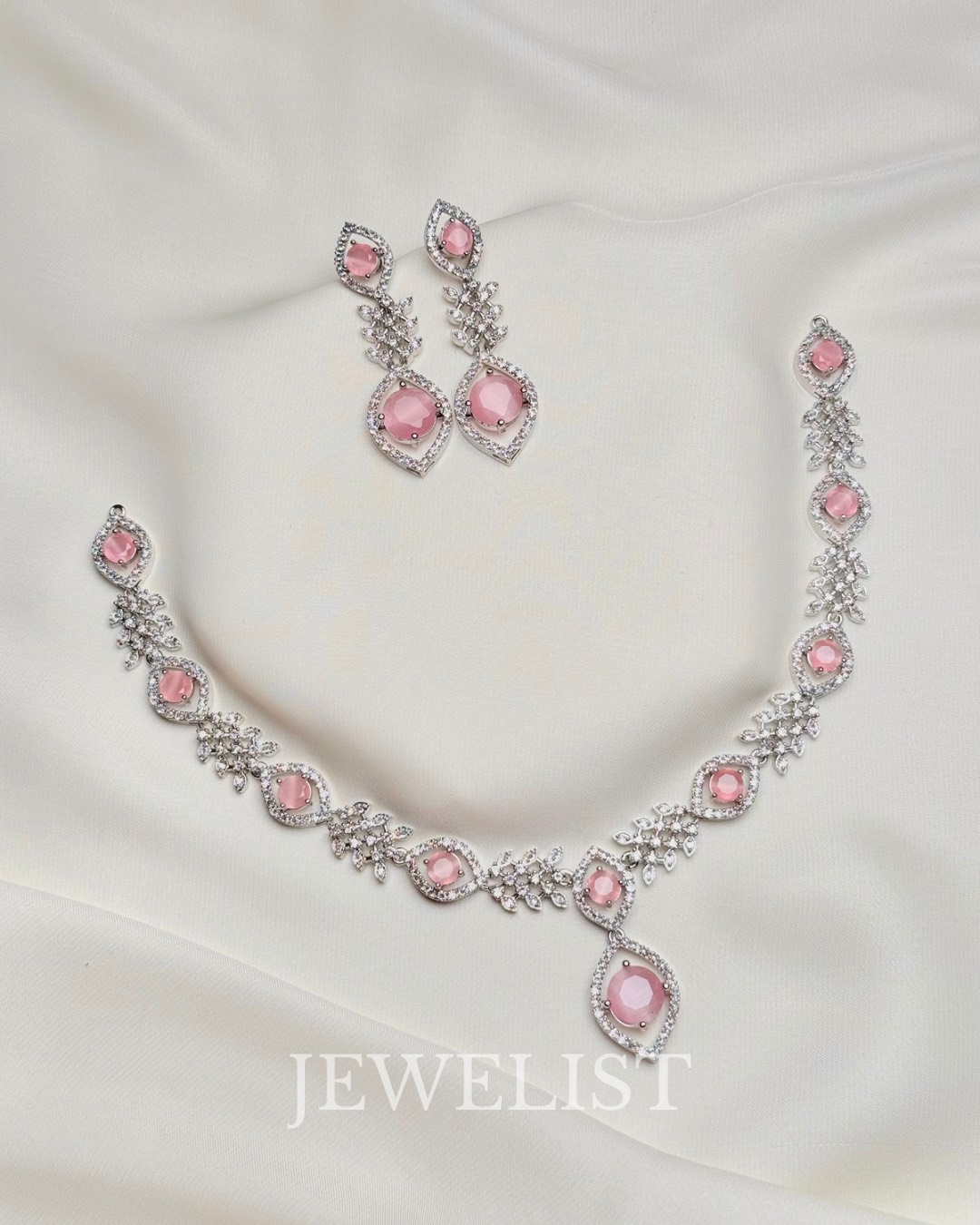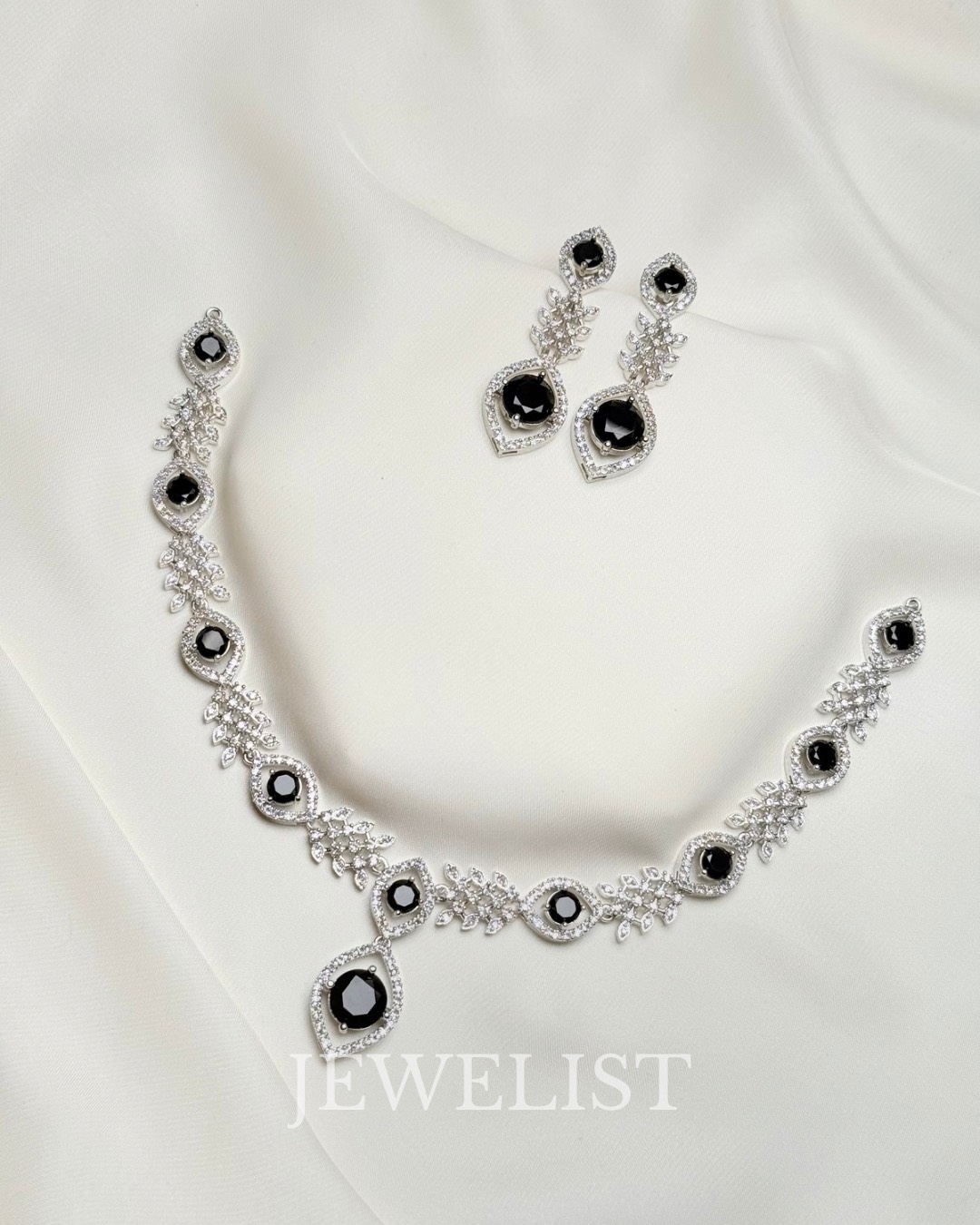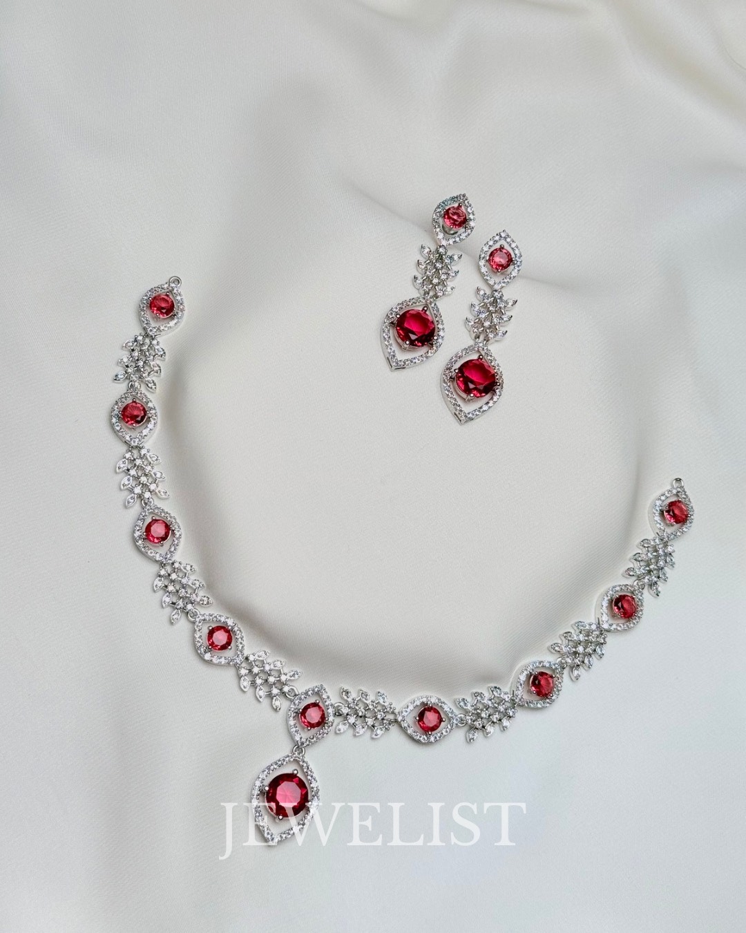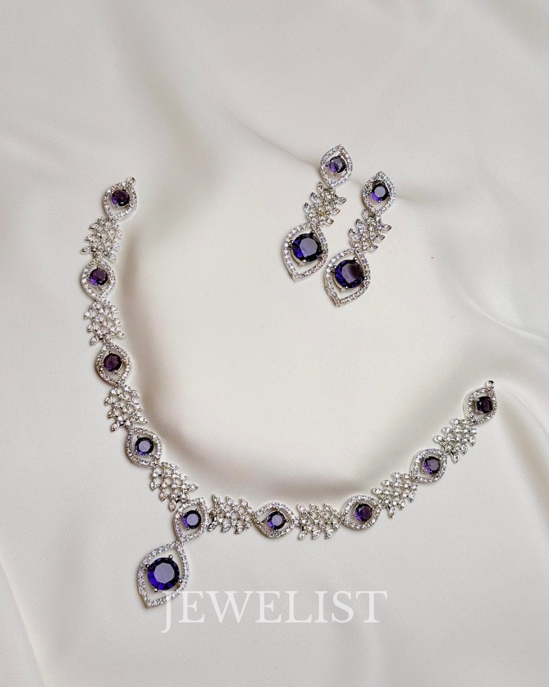 Every piece in this Jewelist Jewellery set showcases a silver-toned base, intricately embellished with sparkling accent stones that create a continuous vine-like pattern. Larger round or oval centerpiece gems—available in multiple colors including Purple, Silver, Blue, Emerald, Red, Black, Pink, and Aqua—add vibrant personality and a luxurious finish. The necklace concludes with a graceful teardrop pendant that mirrors the main earring drop, ensuring a perfectly cohesive bridal or party look.